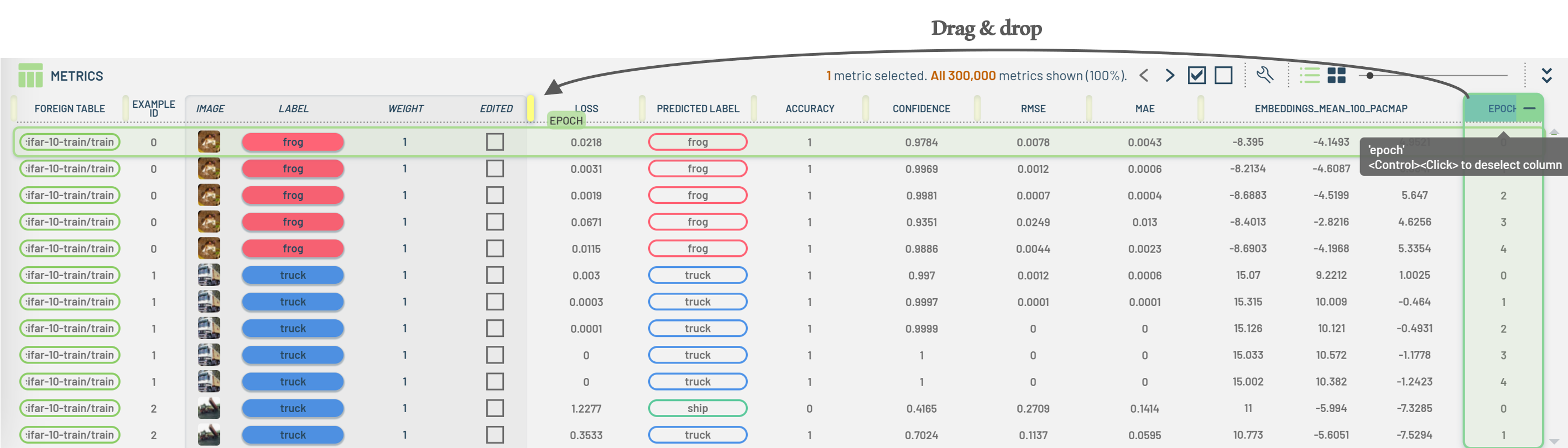 To show a hidden column, click the wrench icon on the table’s toolbar and click the eye icon next to the column’s name in the popup menu. Column names with an open eye are those that are shown, whereas those with a closed eye are hidden. Note: some columns’ names may be nested in another column as indicated by an arrow. For example, the Image column is nested in the Example ID.