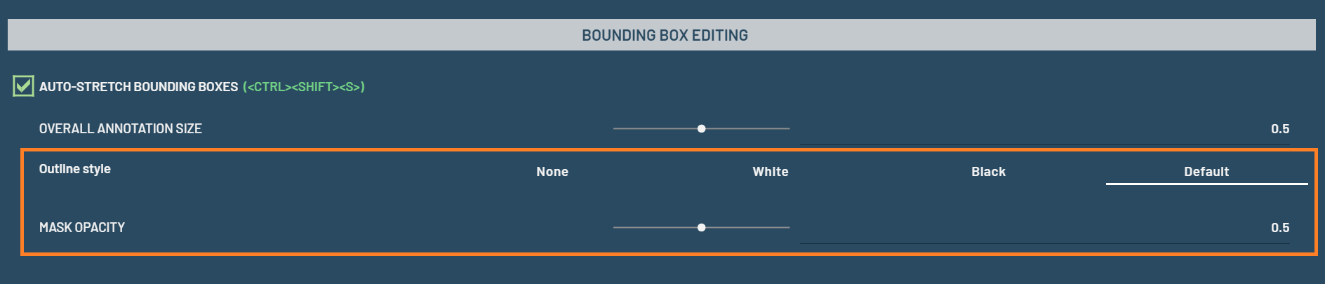 BOUNDING BOX EDITING section. The outline style refers to the outline around the BB when it is selected, and the