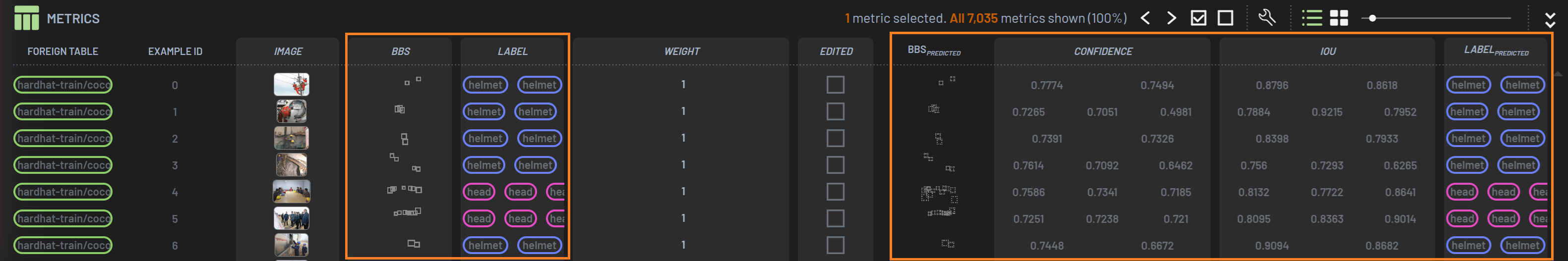 BBs and BB’s property columns, such as BB’s label and confidence, often have multiple values in a row because multiple BBs can be on a given image. In the Metrics/Examples panel, those columns typically only display the first 2-3 values due to the limited width of the columns. However, the number of values or arrays in those columns matches the number of BBs in that row. If you copy and paste the cell values, you will be able to see all the values in those cells. In the figure below, the columns highlighted by orange boxes are this type of columns with multiple values.