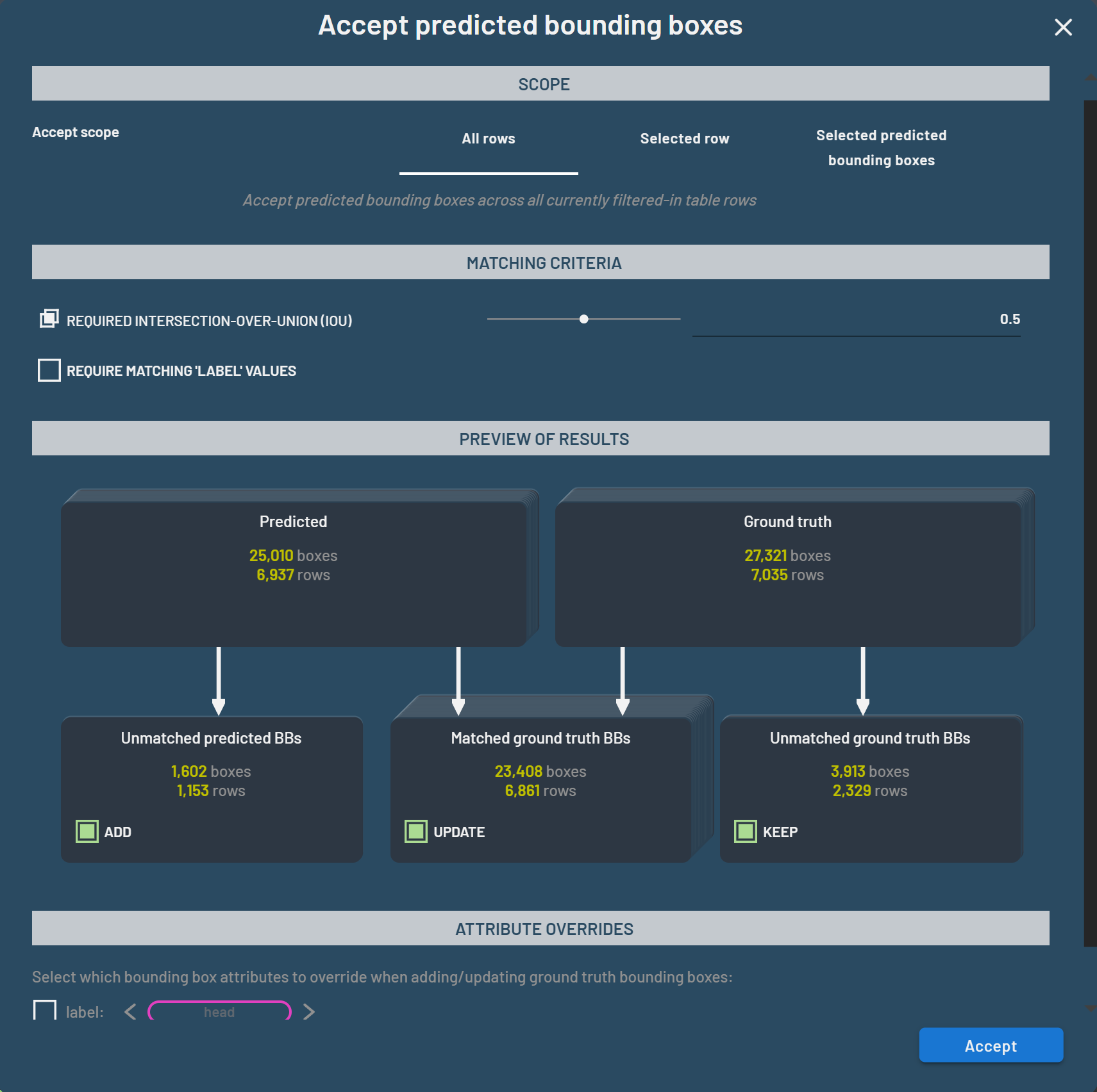 latter will bring up the same Accept predicted bounding boxes dialog except that the scope Selected row will be