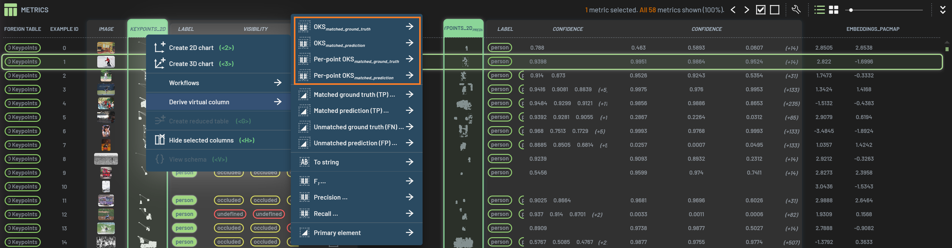 Similar to IOU for BBs, you can derive OKS (Object Keypoint Similarity) virtual columns for the ground truth and the predictions. In addition, you can also derive per-keypoint OKS virtual columns. The former is a standard OKS that calculates the average of all visible keypoints’ OKS for a pose, while the latter presents a value for each keypoint. The context menu shown below can be brought up by selecting the ground truth and predicted keypoint columns and RightClick on one of the column headers.