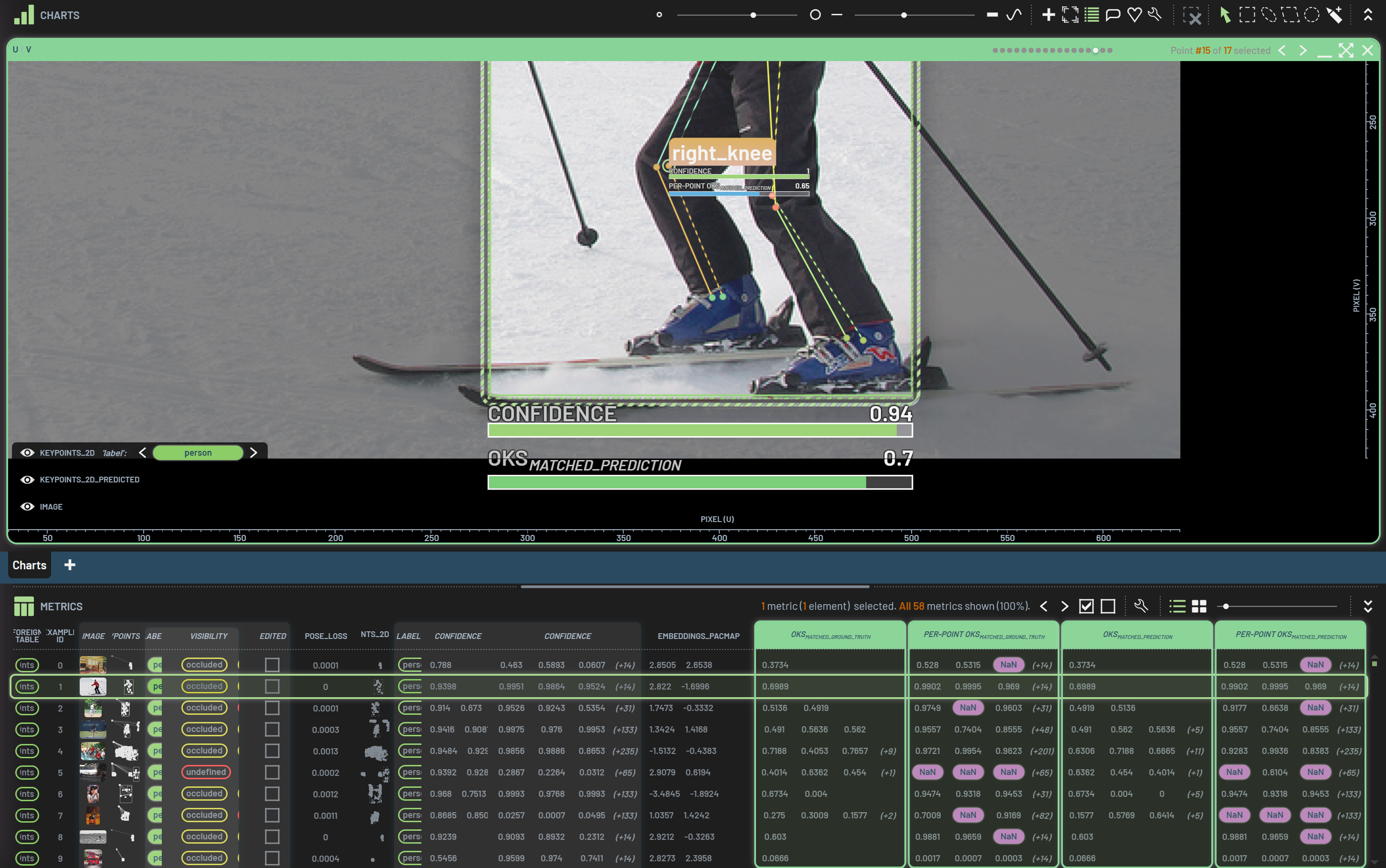 In a keypoints chart, the OKS metric will be displayed below the BB, and the per-keypoint OKS will be next to the keypoint.