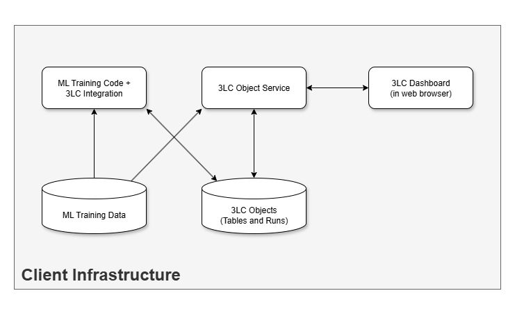 3LC client deployment diagram. The Object Service bridges communication between the ML Training Code with 3LC Integration and the 3LC Dashboard. The Object Service is deployed inside the client architecture, ensuring that all data remains inside the client tier.¶