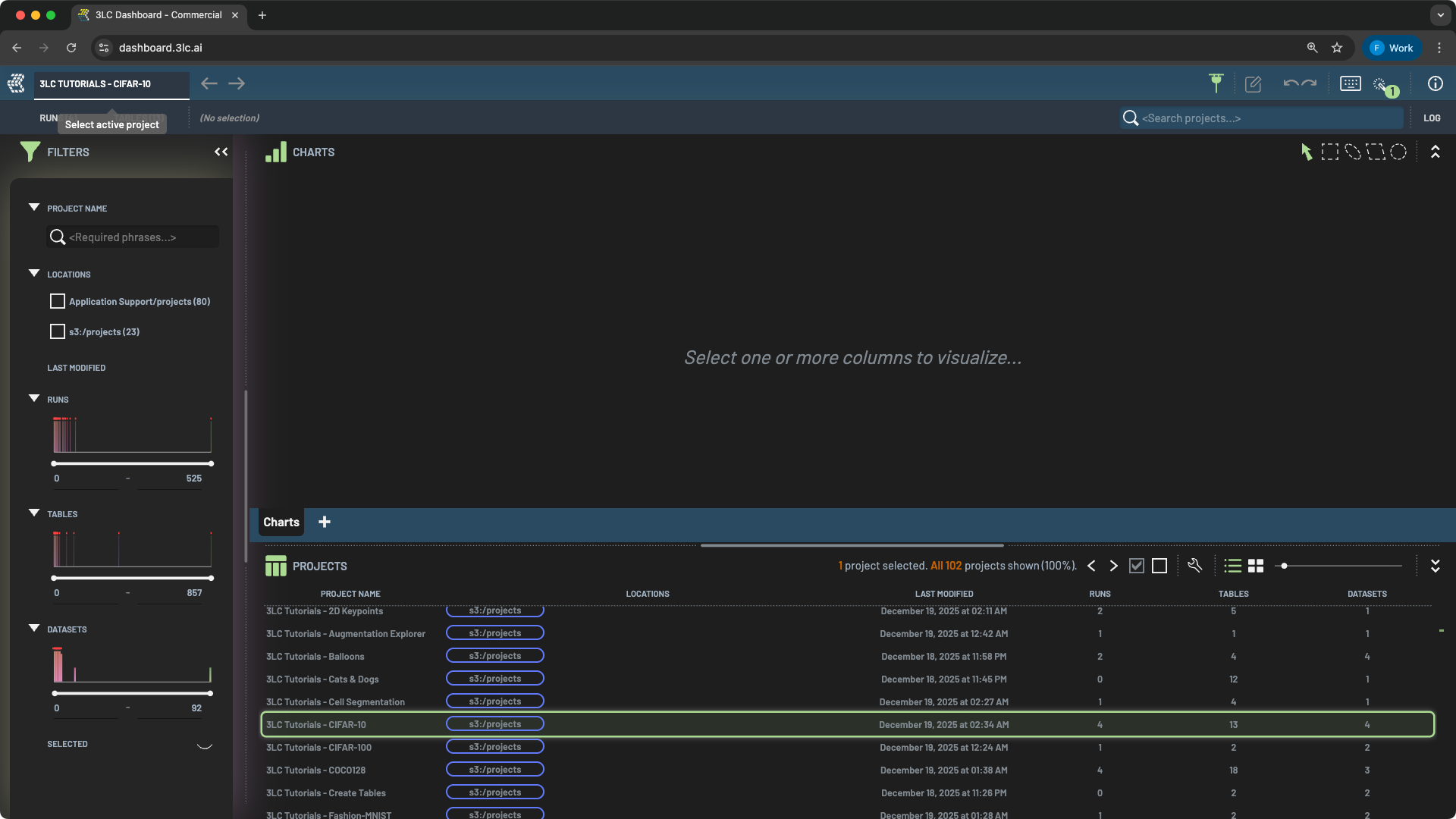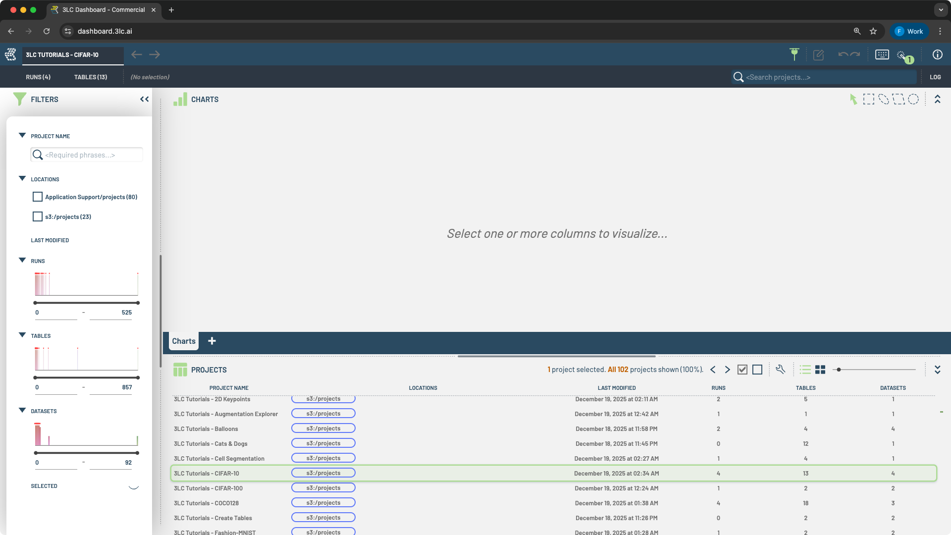 When you open the Dashboard, the initial view is an overview of all the projects indexed by the Object Service. Every new Table or Run that you create from your code available under a specific project.