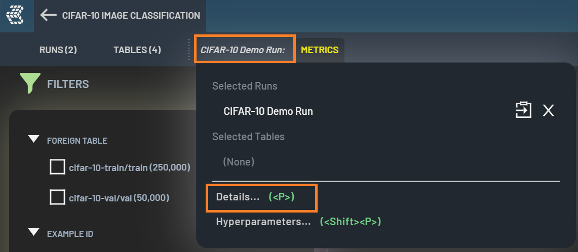 The Run Details dialog displays information about the actively selected Runs, including metrics tables and run input